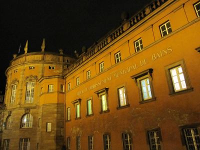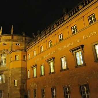 The municipal baths building features Neo-Baroque architecture with two symmetrical swimming pools, thermal spaces, and detailed stone ornamentation on its facade.