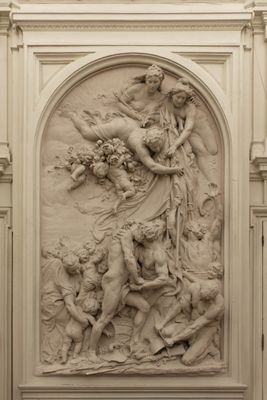 The plaster material of the sculpture allows for intricate details in the figures' expressions and poses, demonstrating Dalou's technical skill.