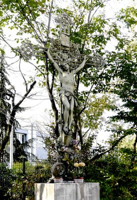 The Croix de l'Evangile represents the last remaining calvary cross within Paris city limits, surrounded by a small garden with grass, flowers, and shrubs.
