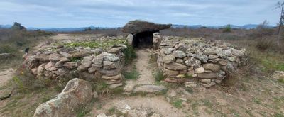 The Dolmen du Molí del Vent features a corridor design with a cairn measuring nine meters in diameter and walls made of dry stones.