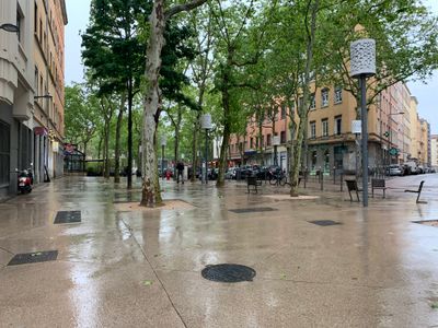 Place des Tapis extends between Boulevard de la Croix-Rousse and Boulevard des Canuts, featuring wide sidewalks lined with four rows of plane trees.