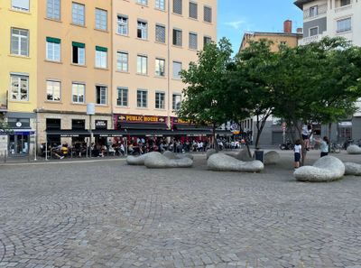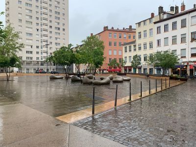 The square displays a statue commemorating the Chant des Canuts near Boulevard des Canuts, accompanied by a large fountain basin at its base.