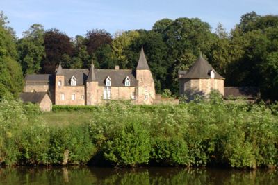 The Château de la Vaucelle features turrets, a dovecote, and crenellated walls, positioned along the banks of the Vire River in Manche department.
