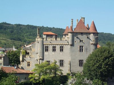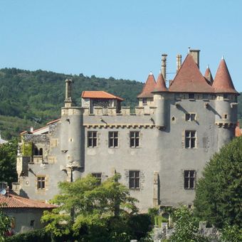 The stone castle stands above the Monne River with three main buildings surrounding an inner courtyard and pepper-pot towers on the eastern side.