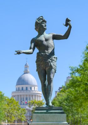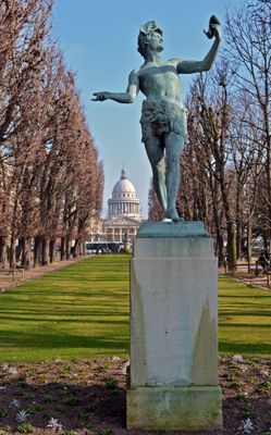 The statue stands at the end of a long lawn aligned with Rue Soufflot, offering direct views of the Pantheon dome in the background.