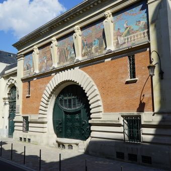 The facade mosaics, created by Auguste Guilbert-Martin, depict detailed scenes of grape harvesting, vinification, bottling, labeling, and packaging processes.