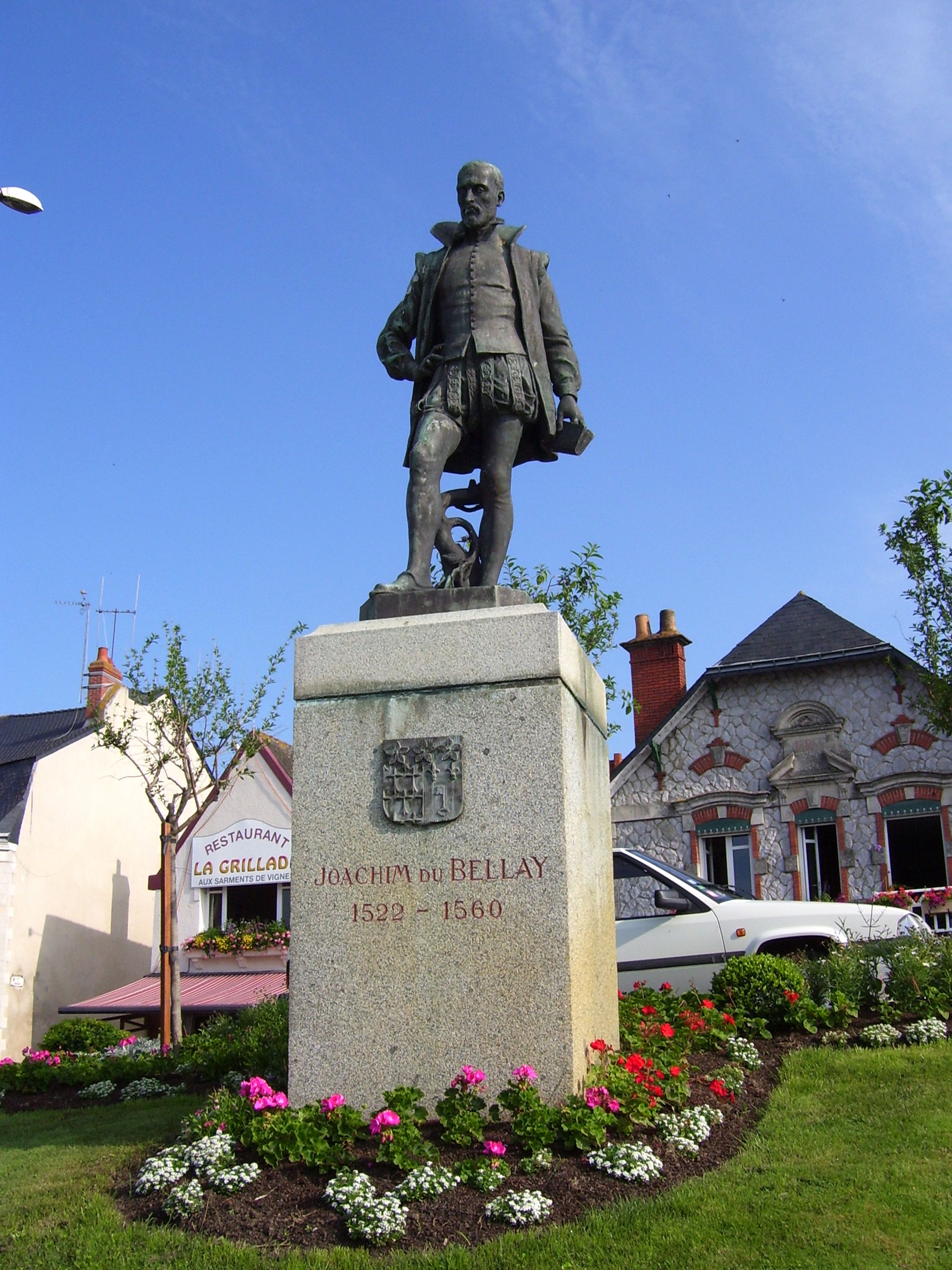 The sculpture honors Joachim du Bellay, a key member of the Pléiade literary movement who championed the use of French vernacular in poetry and significantly influenced the development of Renaissance literature in France.