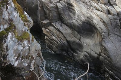 The waterfall consists of two separate cascades, which flow strongest during spring months when water levels increase substantially through the gneiss rock formations.