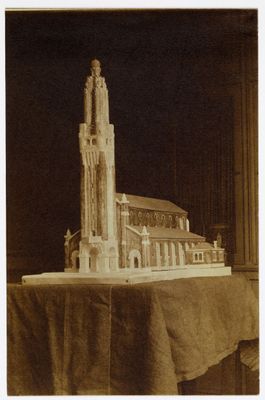 The 56-meter bell tower, completed in 1926 by Paul Tournon, features 28 concrete statues sculpted by Carlo Sarrabezolles depicting Jacob's ladder.