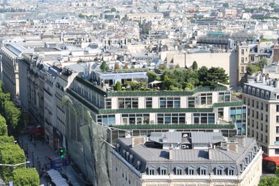 The establishment combines a movie theater, luxury shopping, fine dining, and late-night services in one building facing the Arc de Triomphe.