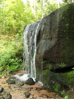 The waterfall area intersects with the Captain Bonnefoy Trail, which contains informational panels detailing events from World War I in this region.