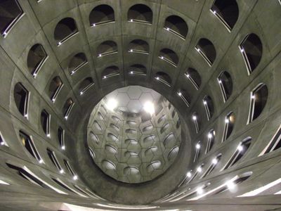 The central column of the parking contains an art installation by Daniel Buren titled Sens Dessus Dessous, visible through a periscope from the square.