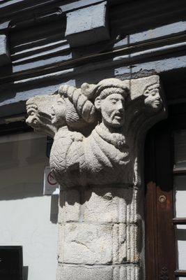 The building's ground floor features four stone columns with intricate figurative sculptures representing individuals wearing typical late 16th-century costumes.