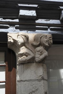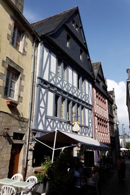The Maison des Cariatides exhibits stone pillars with decorative carvings on its ground floor and timber-framed upper levels at Rue du Guéodet.