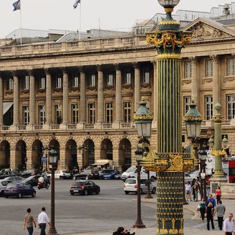 The mansion stands with a neoclassical limestone facade featuring columns and ornate architectural details on Place de la Concorde's western side.