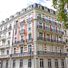 The four-story building features a neoclassical facade made of brick and white stone, structured around a central patio that provides natural light.