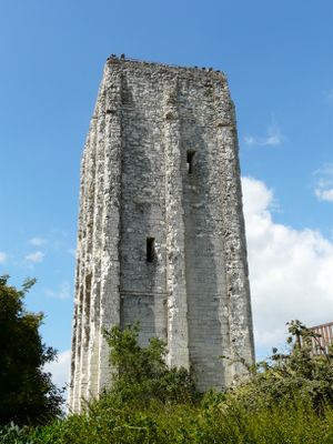 The Château de Loudun features a central square tower and cylindrical fortifications that form an extensive defensive structure in limestone masonry.