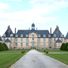 The castle grounds include French-style gardens accessible through a gate decorated with the Menou-Damas family coat of arms.