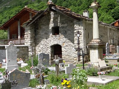 The Chapelle Saint-Antoine stands within the cemetery of Bonneval-sur-Arc, featuring traditional stone roofs characteristic of Savoie regional architecture.