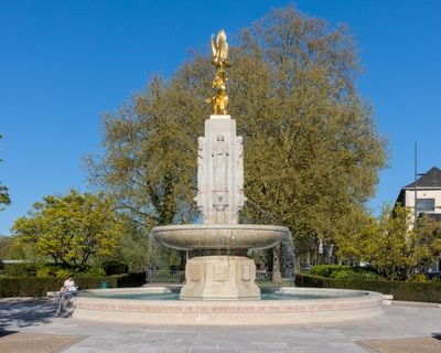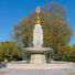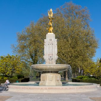 The white stone fountain monument features a gilded statue of an American Indian holding an eagle at its summit, reaching a total height of 10.5 meters.