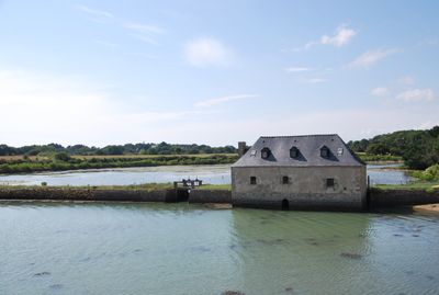 The Meriadec mill stands at the mouth of Rohu, creating a 600,000 cubic meter pond in the Baden cove with a 170-meter granite breakwater.