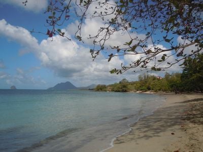 The beach offers direct views of Morne Larcher mountain and Diamond Rock, creating natural swimming basins through scattered rock formations along the water.