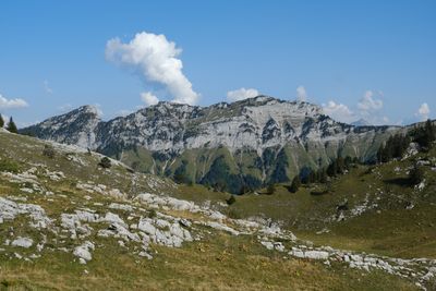 Montagne de Cotagne rises to 1886 meters in the Bornes-Aravis massif, featuring two distinct peaks and steep slopes forming a geological hogback structure.