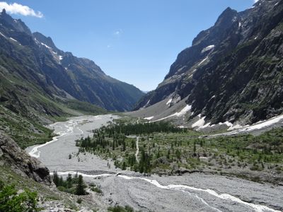 The Vallée de la Vallouise extends between steep mountain walls with a flat bottom, displaying typical characteristics of glacial erosion over geological periods.