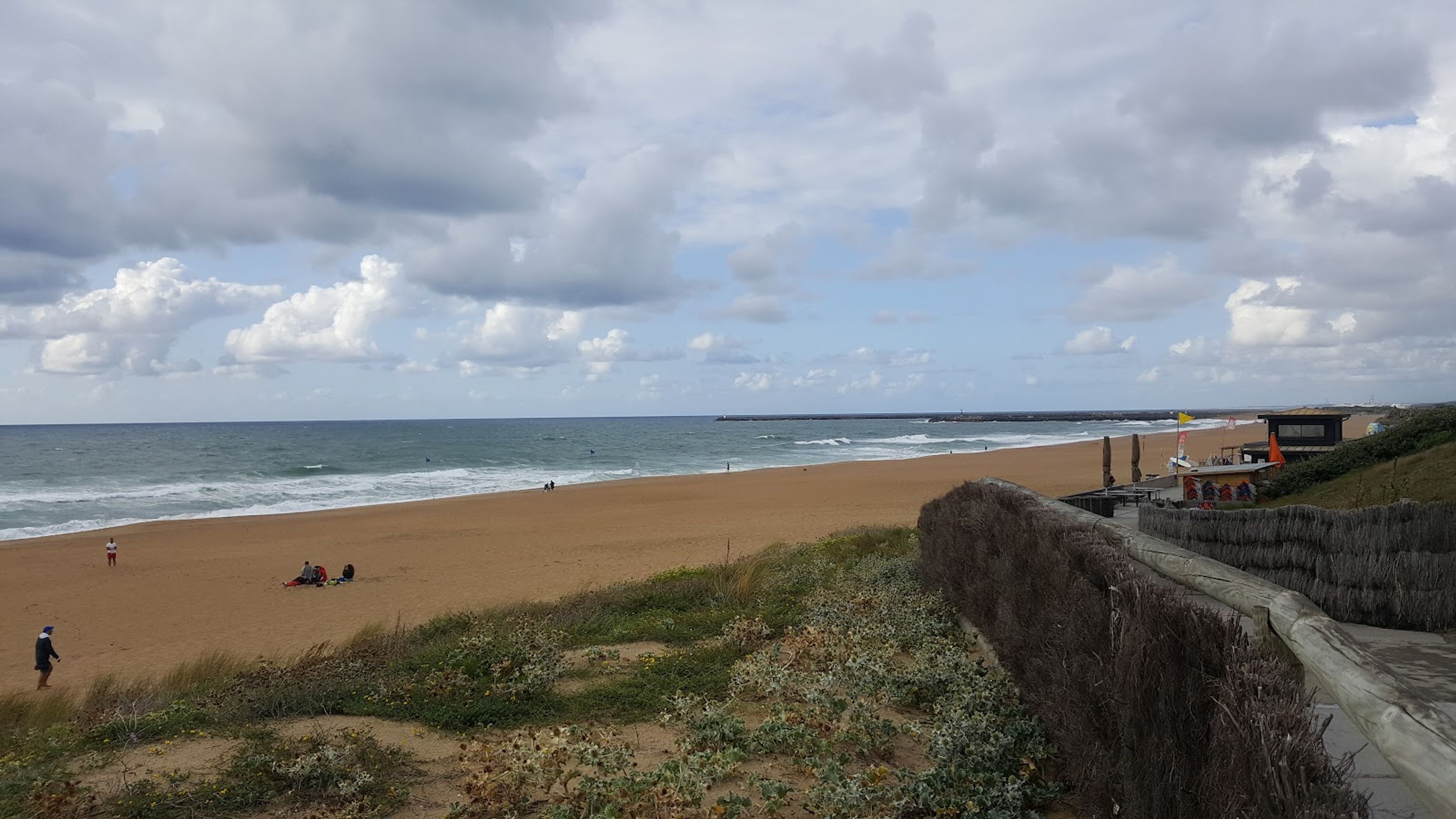The beach stretches along the Atlantic coast with fine sand and clear waters, offering designated areas for various sports activities throughout the year.
