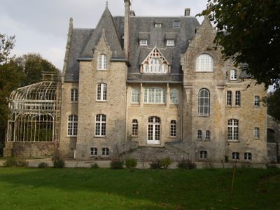 The château displays early 20th-century French architectural elements with symmetrical wings, high windows, and detailed stonework throughout the structure.