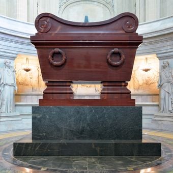 The Tomb of Napoleon is a monumental crypt beneath the famous dome of the Invalides in Paris. The red quartzite sarcophagus rests on a green granite base, surrounded by twelve large Victory sculptures and a mosaic showing scenes of Napoleon's major battles on the floor.