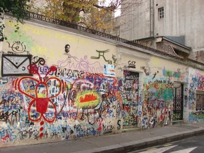 The entrance gate features numerous inscriptions and drawings left by visitors, creating an ever-changing tribute wall to the French musician.