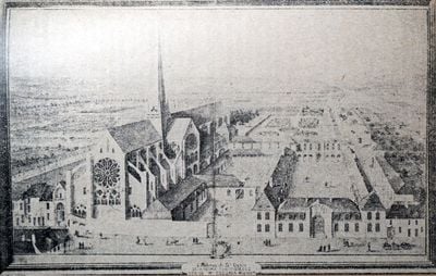 The medieval church and cloisters were destroyed during the French Revolution, leaving only Louis XV style elements including an entrance and courtyard.