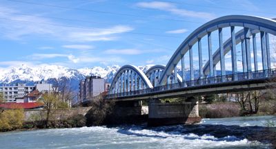 The Pont du Drac spans across the Drac River with its tied-arch design, connecting the districts of Europole in Grenoble with Fontaine.