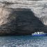 The Sdragonato cave extends into limestone cliffs, featuring a large entrance that allows boats to navigate through its narrow passage into the interior chambers.