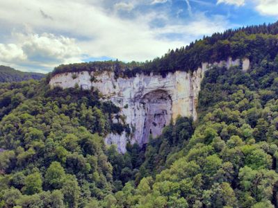 The limestone cave entrance stands beneath a 100-meter-high and 30-meter-wide arcade at the base of a cliff face in the Doubs department.