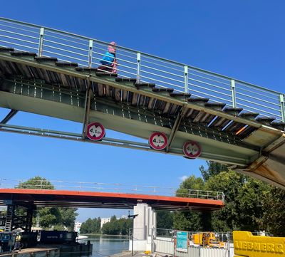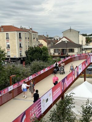 The Passerelle du Franc-Moisin spans the Saint-Denis canal, connecting the Franc-Moisin neighborhood with the Stade de France area through a 40-meter steel structure.