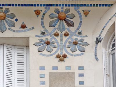 The ceramic tiles by Gentil et Bourdet company in brown, green, and blue colors demonstrate the decorative preferences of early 20th century French architecture.