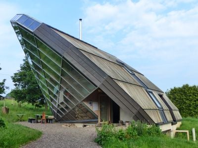 The Heliodome features a sundial shape with large windows and angled walls designed to capture maximum sunlight throughout different seasons.