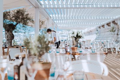 The beach restaurant presents Mediterranean gastronomy with fresh seafood dishes and regional specialties served in a nautical-themed dining environment.