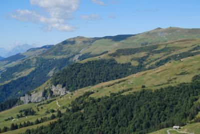 Hikers encounter views of Mont Blanc, the Aravis range, and an artificial lake near the Bellastat chairlift from different vantage points.