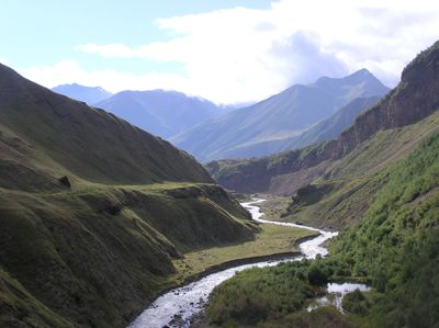 The Truso Valley extends for 15 kilometers through the Greater Caucasus Mountains, featuring steep cliffs and the source of the Tergi River at 2400 meters elevation.