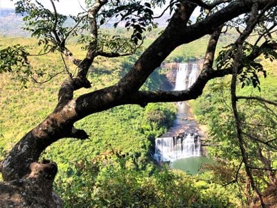 The Kambadaga Falls cascade down in three successive tiers along the Kokoulo River, spreading across 100 meters of rocky terrain.