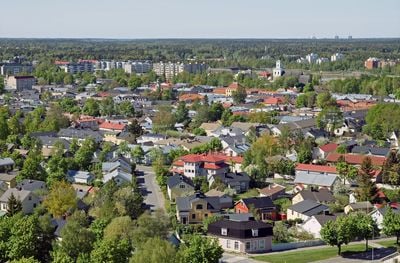 The coastal town of Rauma stretches along the Gulf of Bothnia, featuring neighborhoods of wooden buildings and functioning shipyards near the harbor.