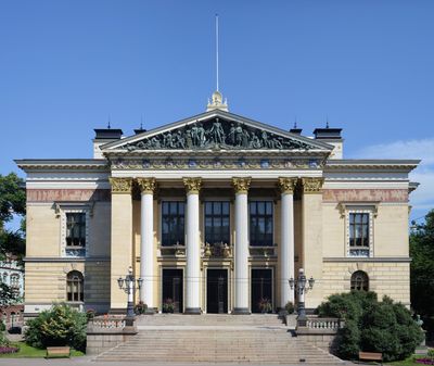The pediment displays Emil Wikström's bronze sculpture depicting Emperor Alexander I confirming Finnish laws and rights at the Diet of Porvoo in 1809.