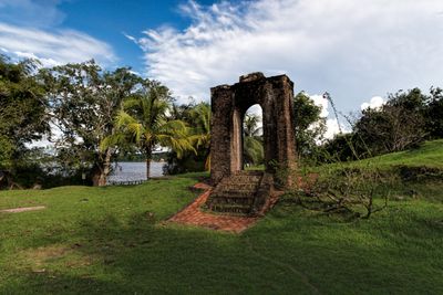 Fort Kyk-Over-Al stands on a 1.5-acre island where the Essequibo, Mazaruni, and Cuyuni rivers meet, featuring brick foundations and an archway.