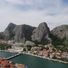 Omiš is a coastal town where the Cetina River flows to the Adriatic from a deep mountain canyon, with high limestone cliffs rising immediately behind the settlement. The town sits between the river mouth to the west and steep rocky terrain to the east, while the sea opens toward the south.
