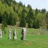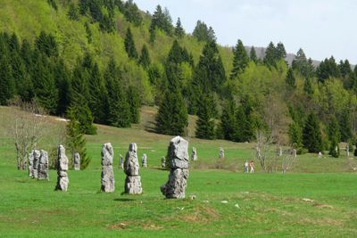 The monument consists of 26 limestone columns arranged in a geometric pattern across a meadow in the Gorski Kotar region.