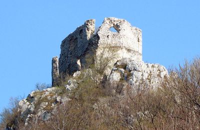Okić is a castle ruin perched on a conical cliff at 498 meters elevation near Samobor. The remaining stone walls frame views of the surrounding valleys and distant hill ranges.