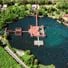 Lake Hévíz is a natural thermal lake fed by underground springs that keep the water warm year-round. A wooden walkway and dock structure extends out over the water, providing access points for swimmers and bathers throughout the lake.